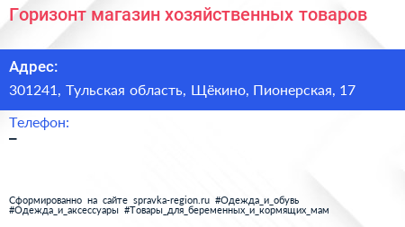 Горизонт, магазин хозяйственных товаров по адресу 301241, Тульская область, Щёкино, Пионерская, 17 в дальнейшем Организация, размещена в следующих категориях:
