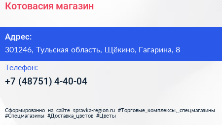 Котовасия, магазин по адресу 301246, Тульская область, Щёкино, Гагарина, 8 в дальнейшем Организация, размещена в следующих категориях: