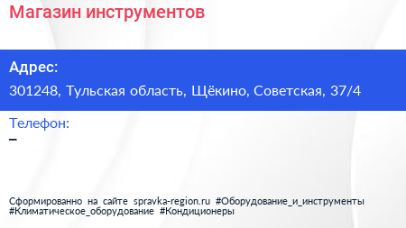 Магазин инструментов по адресу 301248, Тульская область, Щёкино, Советская, 37/4 в дальнейшем Организация, размещена в следующих категориях: