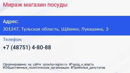 Мираж, магазин посуды по адресу 301247, Тульская область, Щёкино, Лукашина, 3 в дальнейшем Организация, размещена в следующих категориях: