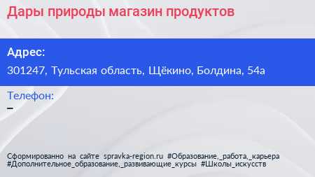 Дары природы, магазин продуктов по адресу 301247, Тульская область, Щёкино, Болдина, 54а в дальнейшем Организация, размещена в следующих категориях: