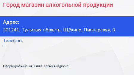 Город, магазин алкогольной продукции по адресу 301241, Тульская область, Щёкино, Пионерская, 3 в дальнейшем Организация, размещена в следующих категориях:
