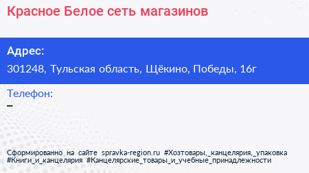 Красное & Белое, сеть магазинов по адресу 301248, Тульская область, Щёкино, Победы, 16г в дальнейшем Организация, размещена в следующих категориях: