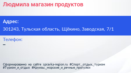 Людмила, магазин продуктов по адресу 301243, Тульская область, Щёкино, Заводская, 7/1 в дальнейшем Организация, размещена в следующих категориях: