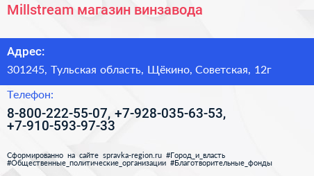 Millstream, магазин винзавода по адресу 301245, Тульская область, Щёкино, Советская, 12г в дальнейшем Организация, размещена в следующих категориях: