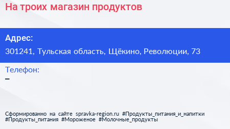 На троих, магазин продуктов по адресу 301241, Тульская область, Щёкино, Революции, 73 в дальнейшем Организация, размещена в следующих категориях: