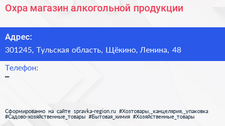 Охра, магазин алкогольной продукции по адресу 301245, Тульская область, Щёкино, Ленина, 48 в дальнейшем Организация, размещена в следующих категориях: