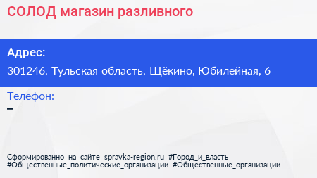 СОЛОД, магазин разливного по адресу 301246, Тульская область, Щёкино, Юбилейная, 6 в дальнейшем Организация, размещена в следующих категориях:
