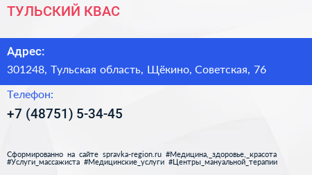 ТУЛЬСКИЙ КВАС по адресу 301248, Тульская область, Щёкино, Советская, 76 в дальнейшем Организация, размещена в следующих категориях: