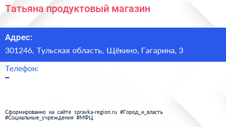 Татьяна, продуктовый магазин по адресу 301246, Тульская область, Щёкино, Гагарина, 3 в дальнейшем Организация, размещена в следующих категориях: