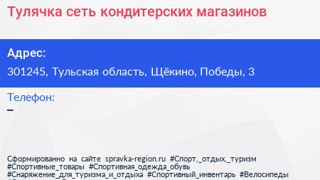 Тулячка, сеть кондитерских магазинов по адресу 301245, Тульская область, Щёкино, Победы, 3 в дальнейшем Организация, размещена в следующих категориях:
