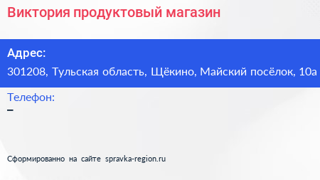 Виктория, продуктовый магазин по адресу 301208, Тульская область, Щёкино, Майский посёлок, 10а в дальнейшем Организация, размещена в следующих категориях: