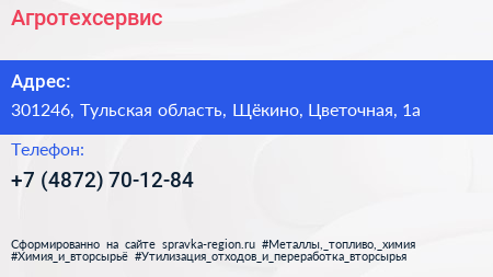 Агротехсервис по адресу 301246, Тульская область, Щёкино, Цветочная, 1а в дальнейшем Организация, размещена в следующих категориях: