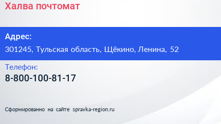 Халва, почтомат по адресу 301245, Тульская область, Щёкино, Ленина, 52 в дальнейшем Организация, размещена в следующих категориях: