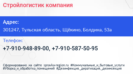 Стройлогистик, компания по адресу 301247, Тульская область, Щёкино, Болдина, 53а в дальнейшем Организация, размещена в следующих категориях: