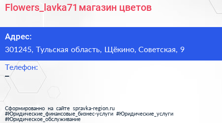 Flowers_lavka71, магазин цветов по адресу 301245, Тульская область, Щёкино, Советская, 9 в дальнейшем Организация, размещена в следующих категориях: