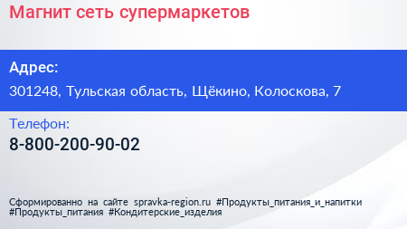 Магнит, сеть супермаркетов по адресу 301248, Тульская область, Щёкино, Колоскова, 7 в дальнейшем Организация, размещена в следующих категориях: