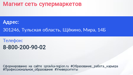 Магнит, сеть супермаркетов по адресу 301246, Тульская область, Щёкино, Мира, 14Б в дальнейшем Организация, размещена в следующих категориях: