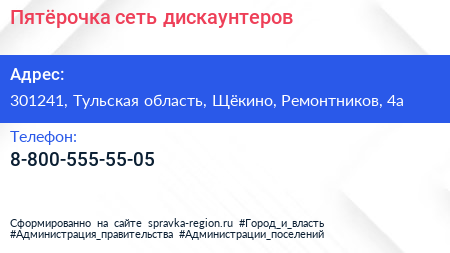 Пятёрочка, сеть дискаунтеров по адресу 301241, Тульская область, Щёкино, Ремонтников, 4а в дальнейшем Организация, размещена в следующих категориях:
