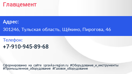 Главцемент по адресу 301246, Тульская область, Щёкино, Пирогова, 46 в дальнейшем Организация, размещена в следующих категориях: