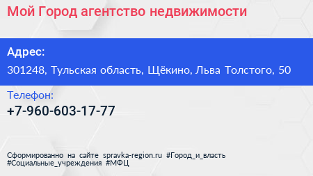 Мой Город, агентство недвижимости по адресу 301248, Тульская область, Щёкино, Льва Толстого, 50 в дальнейшем Организация, размещена в следующих категориях: