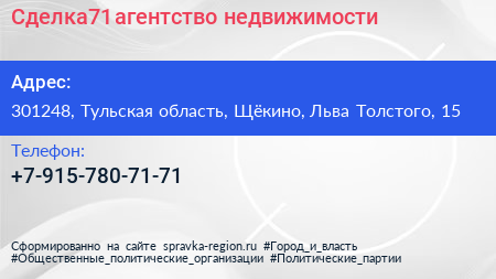 Сделка71, агентство недвижимости по адресу 301248, Тульская область, Щёкино, Льва Толстого, 15 в дальнейшем Организация, размещена в следующих категориях: