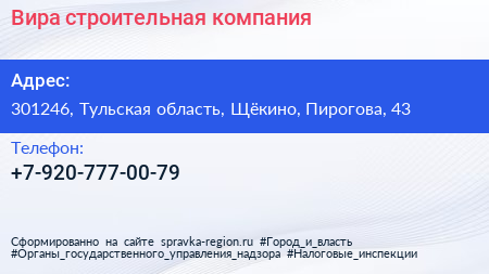 Вира, строительная компания по адресу 301246, Тульская область, Щёкино, Пирогова, 43 в дальнейшем Организация, размещена в следующих категориях:
