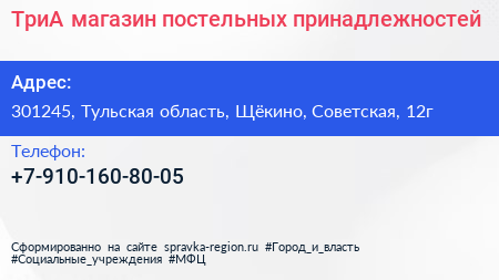 ТриА, магазин постельных принадлежностей по адресу 301245, Тульская область, Щёкино, Советская, 12г в дальнейшем Организация, размещена в следующих категориях: