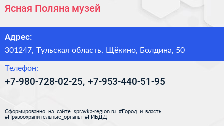 Ясная Поляна, музей по адресу 301247, Тульская область, Щёкино, Болдина, 50 в дальнейшем Организация, размещена в следующих категориях: