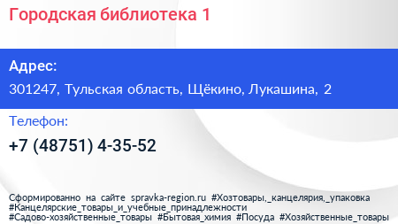 Городская библиотека №1 по адресу 301247, Тульская область, Щёкино, Лукашина, 2 в дальнейшем Организация, размещена в следующих категориях: