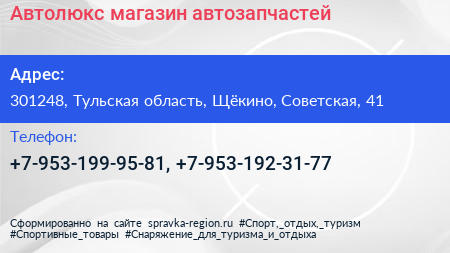 Автолюкс, магазин автозапчастей по адресу 301248, Тульская область, Щёкино, Советская, 41 в дальнейшем Организация, размещена в следующих категориях: