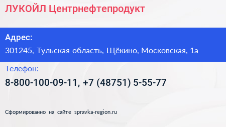 ЛУКОЙЛ-Центрнефтепродукт по адресу 301245, Тульская область, Щёкино, Московская, 1а в дальнейшем Организация, размещена в следующих категориях: