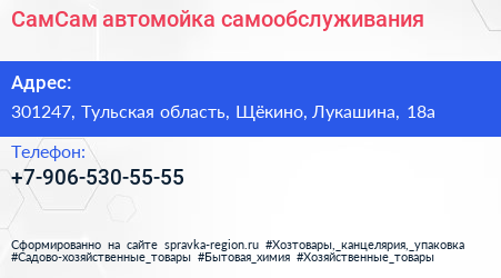 СамСам, автомойка самообслуживания по адресу 301247, Тульская область, Щёкино, Лукашина, 18а в дальнейшем Организация, размещена в следующих категориях: