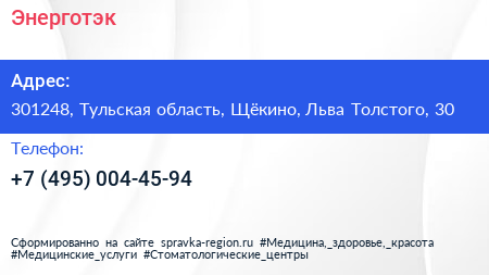 Энерготэк по адресу 301248, Тульская область, Щёкино, Льва Толстого, 30 в дальнейшем Организация, размещена в следующих категориях: