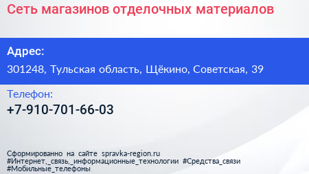 Сеть магазинов отделочных материалов по адресу 301248, Тульская область, Щёкино, Советская, 39 в дальнейшем Организация, размещена в следующих категориях: