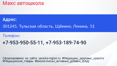 Макс, автошкола по адресу 301245, Тульская область, Щёкино, Ленина, 51 в дальнейшем Организация, размещена в следующих категориях:
