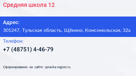 Средняя школа №12 по адресу 301247, Тульская область, Щёкино, Комсомольская, 32а в дальнейшем Организация, размещена в следующих категориях: