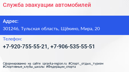 Служба эвакуации автомобилей по адресу 301246, Тульская область, Щёкино, Мира, 20 в дальнейшем Организация, размещена в следующих категориях: