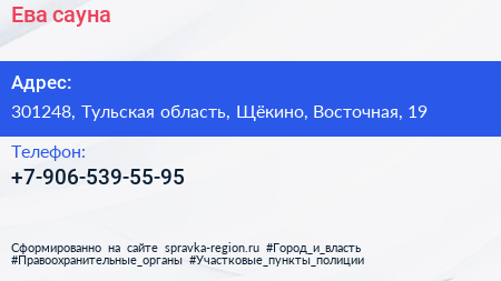 Ева, сауна по адресу 301248, Тульская область, Щёкино, Восточная, 19 в дальнейшем Организация, размещена в следующих категориях:
