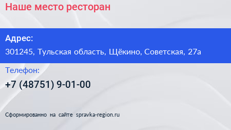 Наше место, ресторан по адресу 301245, Тульская область, Щёкино, Советская, 27а в дальнейшем Организация, размещена в следующих категориях: