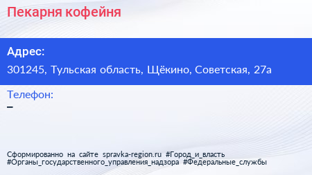 Пекарня-кофейня по адресу 301245, Тульская область, Щёкино, Советская, 27а в дальнейшем Организация, размещена в следующих категориях: