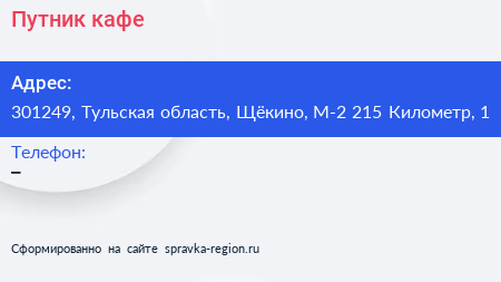 Путник, кафе по адресу 301249, Тульская область, Щёкино, М-2 215 Километр, 1 в дальнейшем Организация, размещена в следующих категориях: