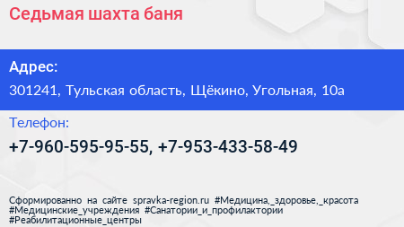 Седьмая шахта, баня по адресу 301241, Тульская область, Щёкино, Угольная, 10а в дальнейшем Организация, размещена в следующих категориях: