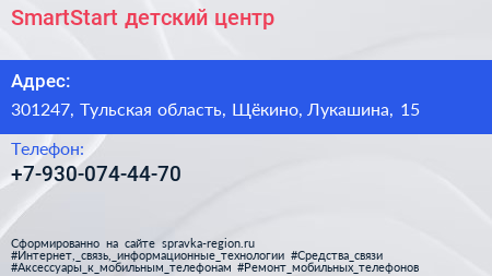 SmartStart, детский центр по адресу 301247, Тульская область, Щёкино, Лукашина, 15 в дальнейшем Организация, размещена в следующих категориях: