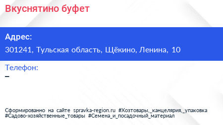Вкуснятино, буфет по адресу 301241, Тульская область, Щёкино, Ленина, 10 в дальнейшем Организация, размещена в следующих категориях: