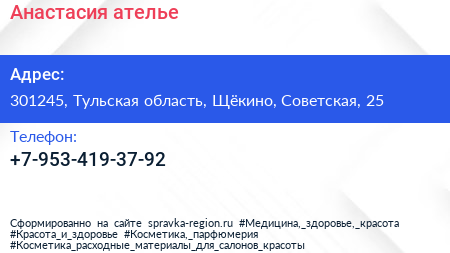 Анастасия, ателье по адресу 301245, Тульская область, Щёкино, Советская, 25 в дальнейшем Организация, размещена в следующих категориях: