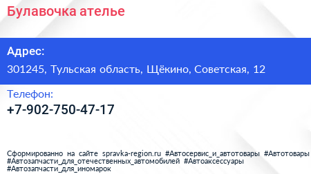 Булавочка, ателье по адресу 301245, Тульская область, Щёкино, Советская, 12 в дальнейшем Организация, размещена в следующих категориях: