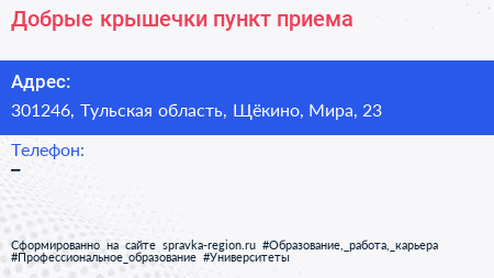 Добрые крышечки, пункт приема по адресу 301246, Тульская область, Щёкино, Мира, 23 в дальнейшем Организация, размещена в следующих категориях:
