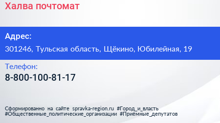 Халва, почтомат по адресу 301246, Тульская область, Щёкино, Юбилейная, 19 в дальнейшем Организация, размещена в следующих категориях: