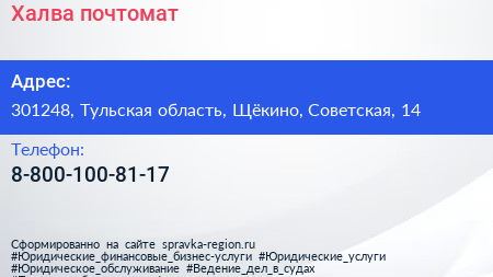 Халва, почтомат по адресу 301248, Тульская область, Щёкино, Советская, 14 в дальнейшем Организация, размещена в следующих категориях: